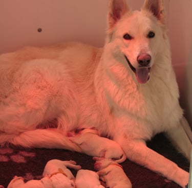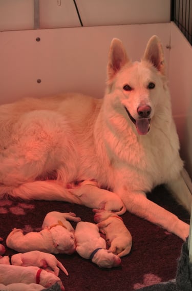 Ce 4 mars 2026 les premiers Bergers Blancs Suisse de la Comète blanche ont pointé leur petits museaux. 9 petites truffes, 7 mâles et 2 femelles ont vu le jour. Ils seraient donc disponibles vers le mois de mai 2026.